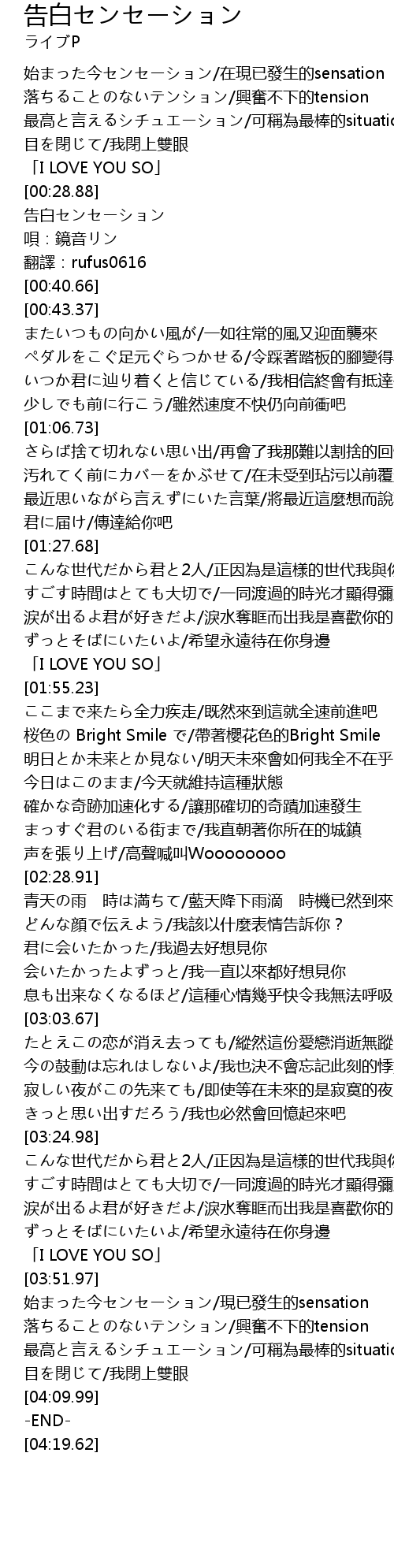 | [00:29.99] | 告白センセーション |
