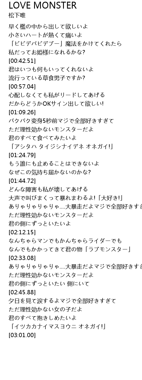 | [02:25.60] | なんでもかかってきて君の物「ラブモンスター」 |