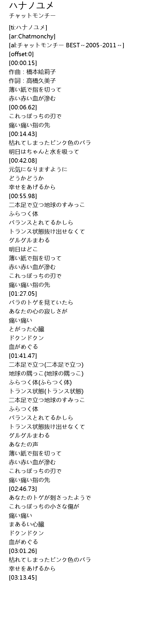 | [02:11.81] | ふらつく体(ふらつく体) |