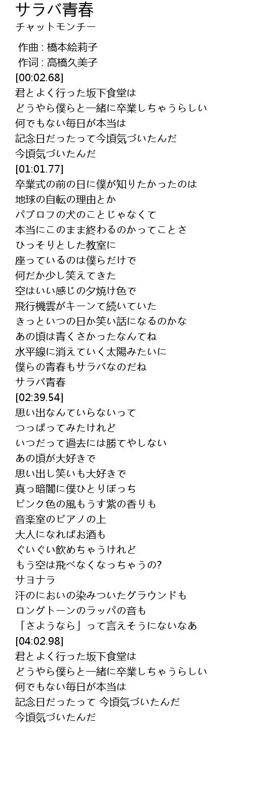| [02:24.64] | 僕らの青春もサラバなのだね |
