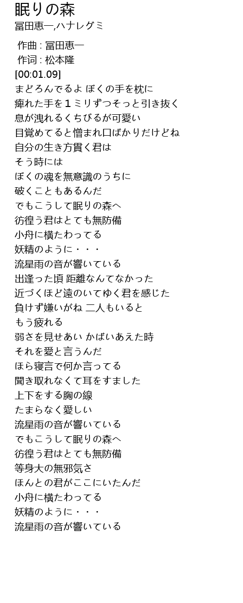 | [00:17.07] | まどろんでるよ ぼくの手を枕に |