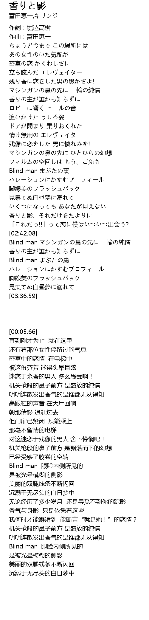 | [02:56.59] | Blind man マシンガンの鼻の先に 一輪の純情 |