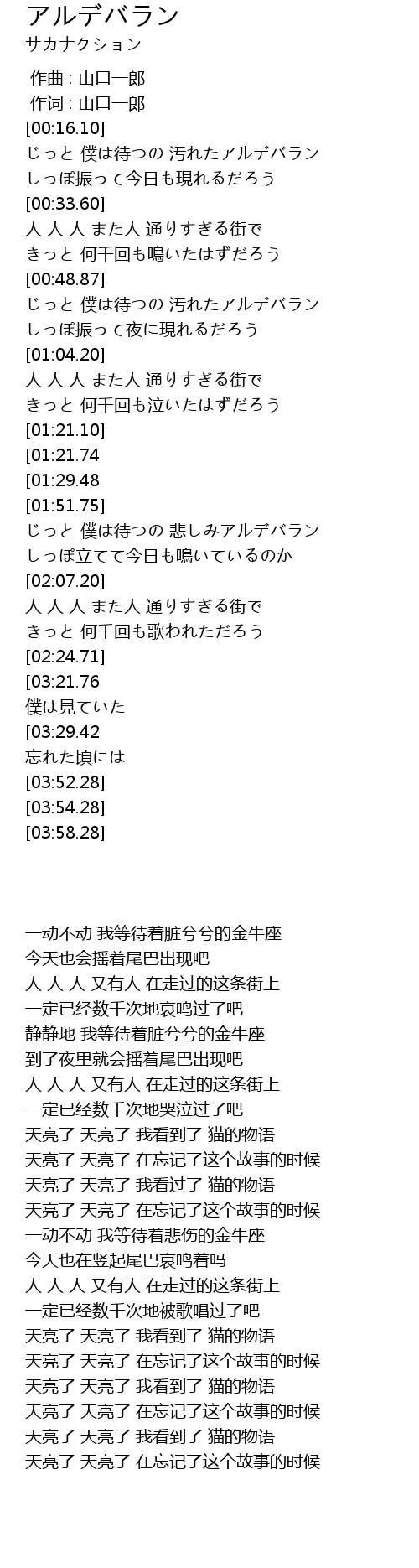 | [00:49.52] | じっと 僕は待つの 汚れたアルデバラン |