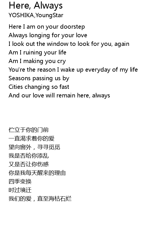 | [01:00.21] | And our love will remain here, always |