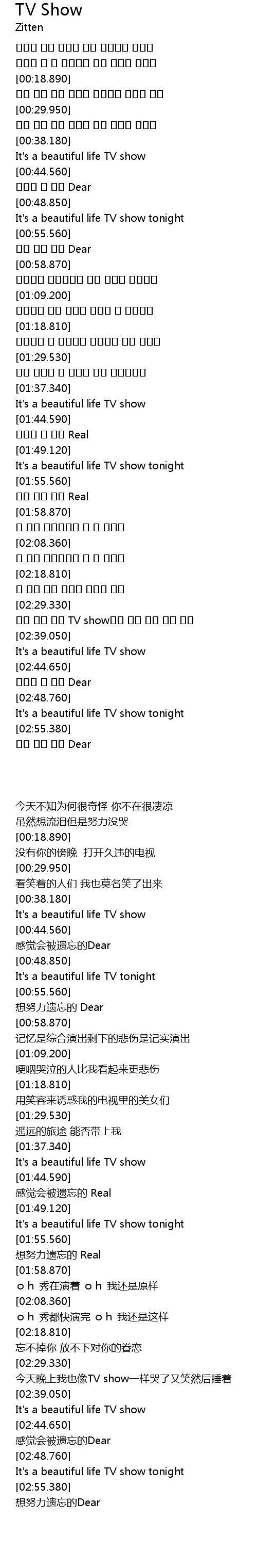 | [02:31.630] | 오늘 밤도 나는 TV show처럼 울다 웃다 잠이 들어 |
