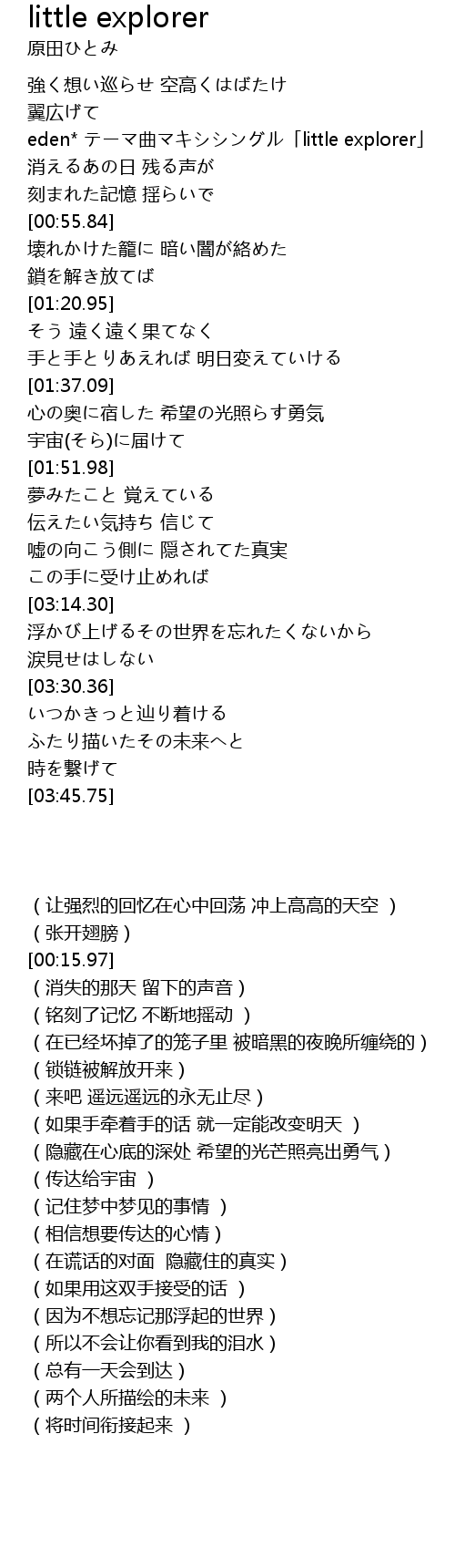 | [00:15.97]eden* テーマ曲マキシシングル「little explorer」] | |