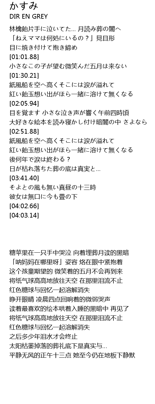 | [03:18.92] | 後何年で涙は終わる? 日が枯れ落ちた葬の底は真実と... |