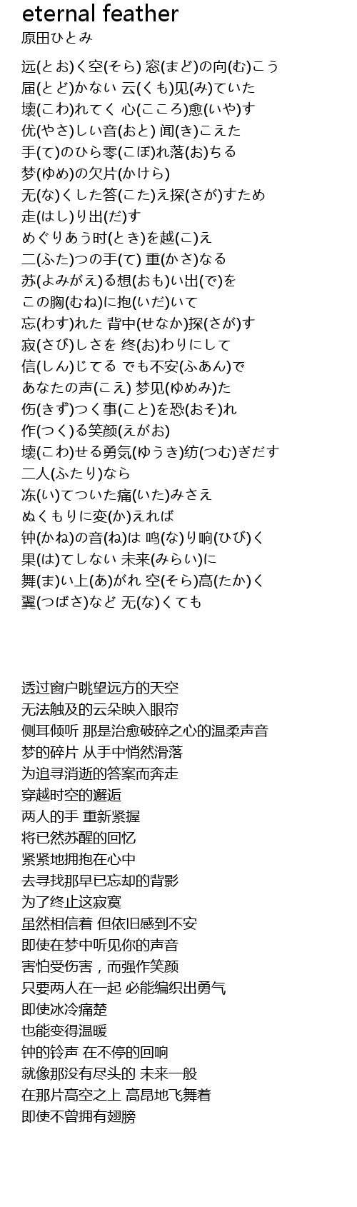| [00:33.259] | 远(とお)く空(そら) 窓(まど)の向(む)こう |