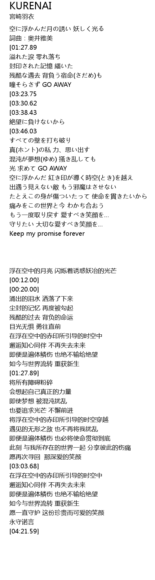 | [00:52.28][03:23.75] | 空に浮かんだ 紅き印が導く時空(とき)の中 |