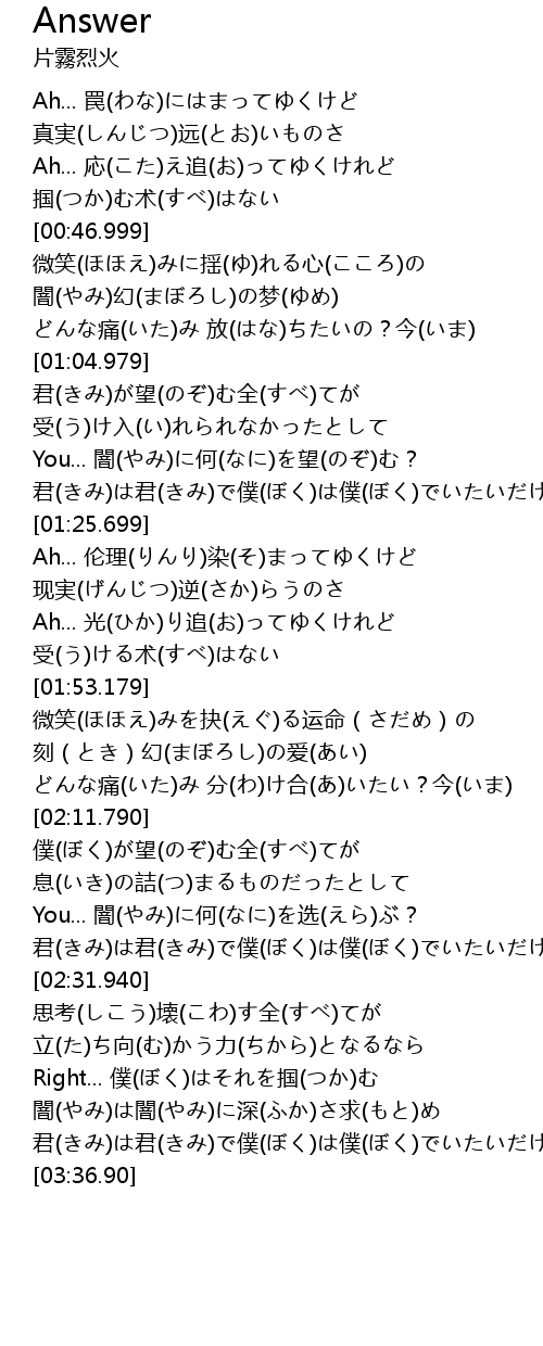 | [00:38.129] | Ah... 応(こた)え追(お)ってゆくけれど |