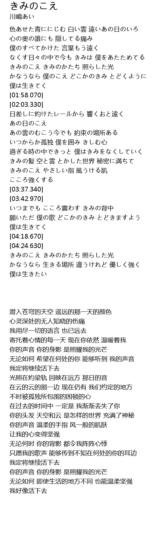 | [03:57.930] | 願いただ 僕の歌 どこかのきみ とどきますよう |