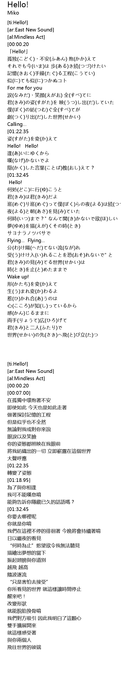 | [01:29.10][01:32.45][03:05.40][03:08.45][03:11.85][03:18.65][03:22.15][03:25.45] | Hello! Hello! |