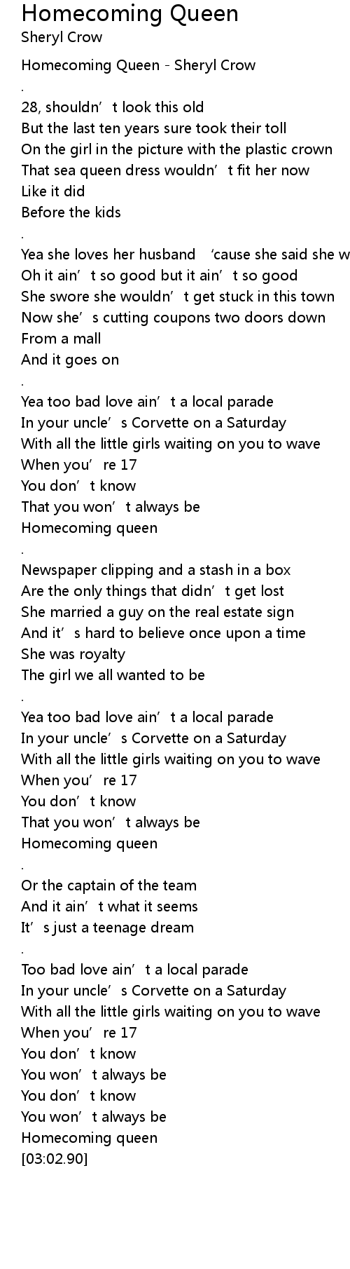 | [00:00.51] | Homecoming Queen - Sheryl Crow |