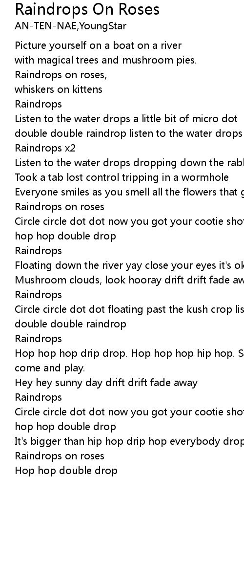 Circle circle dot dot floating past the kush crop listen to the water drop, double double raindrop |