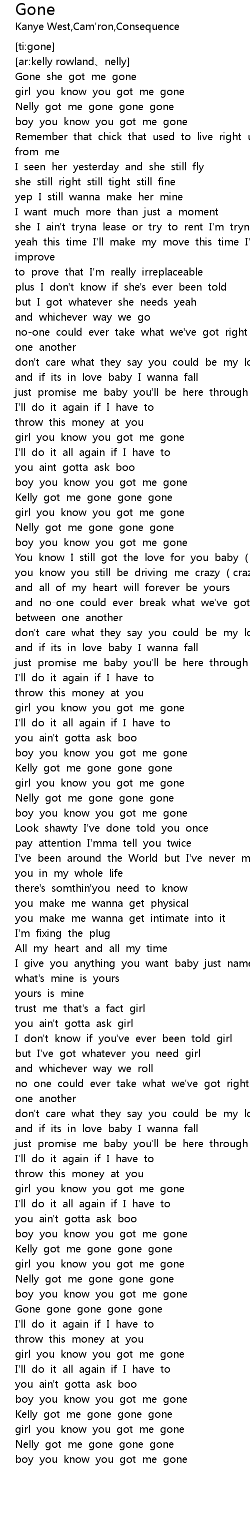 | [04:10.412] | Kelly got me gone gone gone |