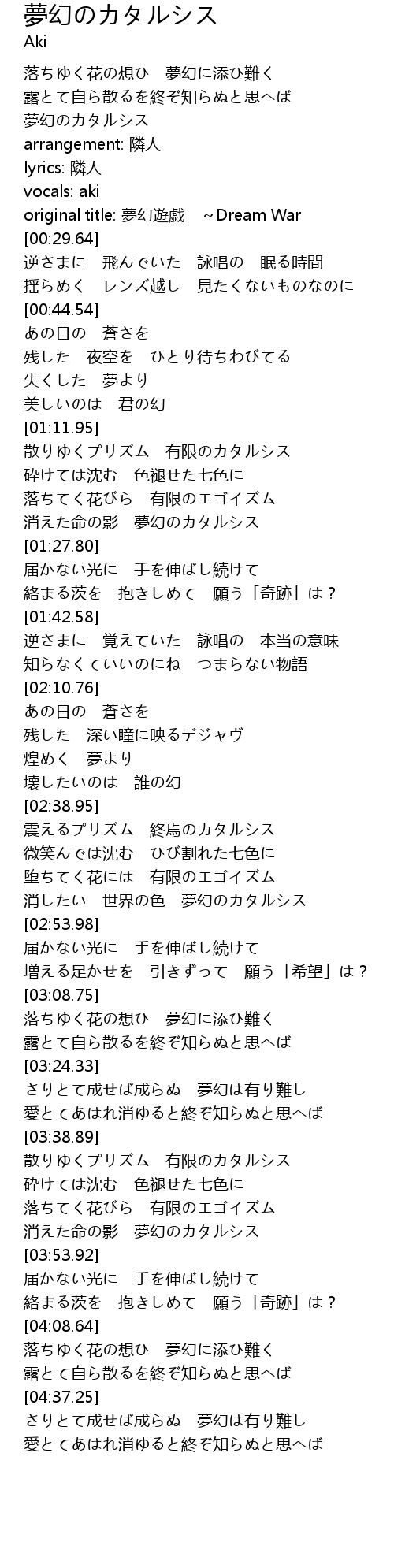 | [04:23.27] | 落ちゆく花の想ひ 夢幻に添ひ難く |