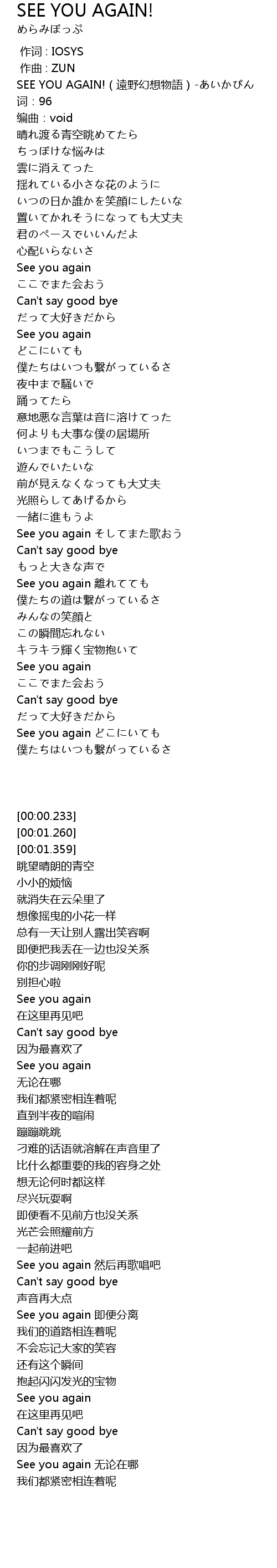 | [00:00.233] | SEE YOU AGAIN! yuan ye huan xiang wu yu |