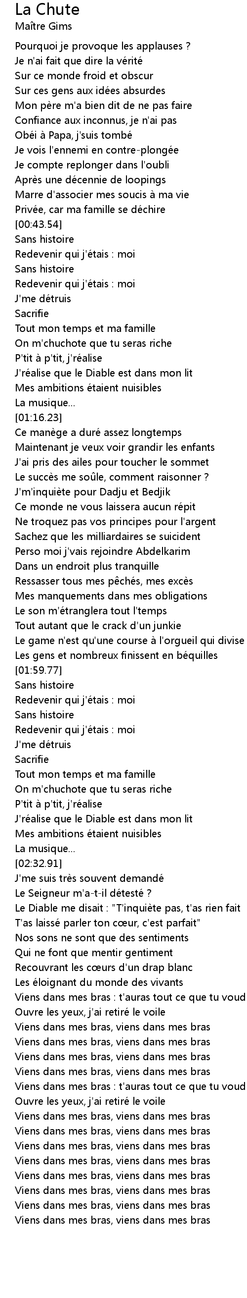 | [02:55.17] | Viens dans mes bras : t'auras tout ce que tu voudras |