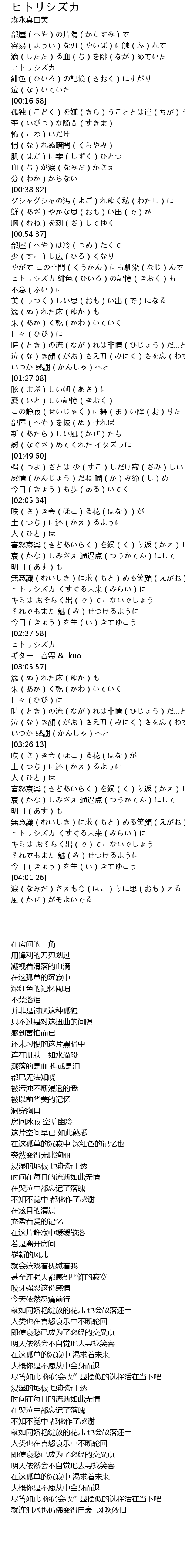 | [01:04.29] | ヒトリシズカ 緋色(ひいろ)の記憶(きおく)も |