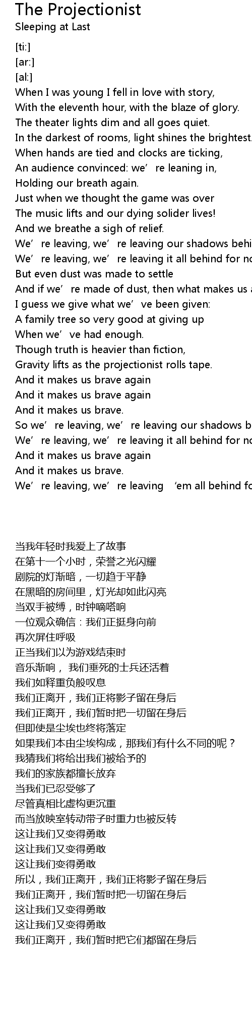 | [02:56.87] | We' re leaving, we' re leaving it all behind for now. |