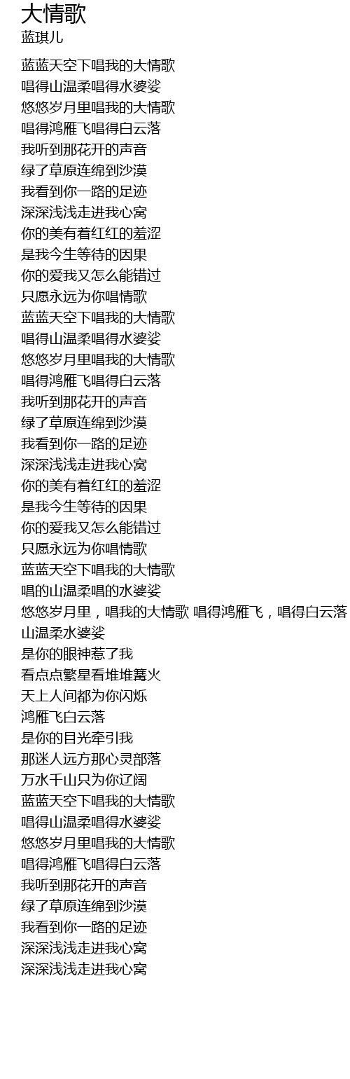 | [03:01.32] | 悠悠岁月里,唱我的大情歌 唱得鸿雁飞,唱得白云落 山温柔水婆娑 |