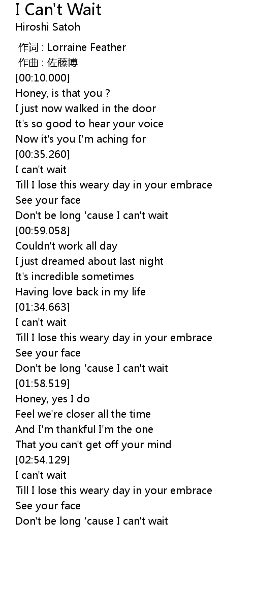 | [01:53.160] | Don't be long 'cause I can't wait |