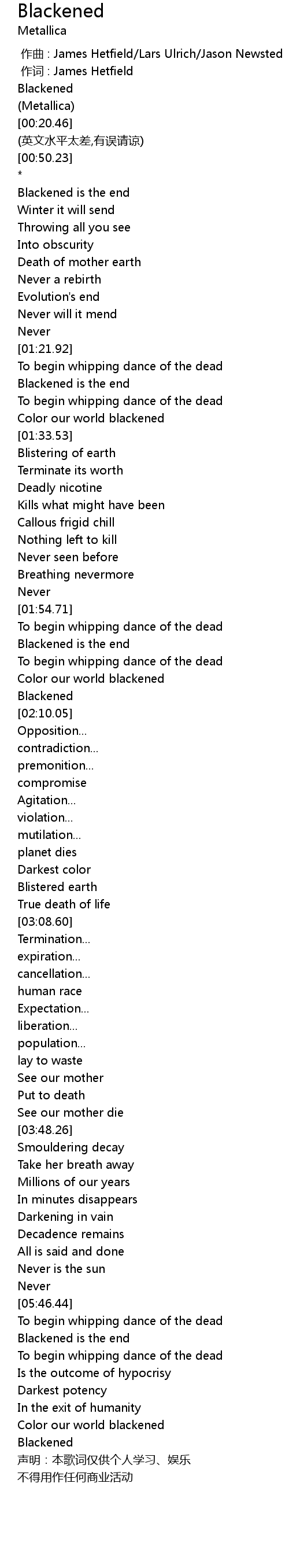 | [00:00.00] | 作曲 : James Hetfield/Lars Ulrich/Jason Newsted |
