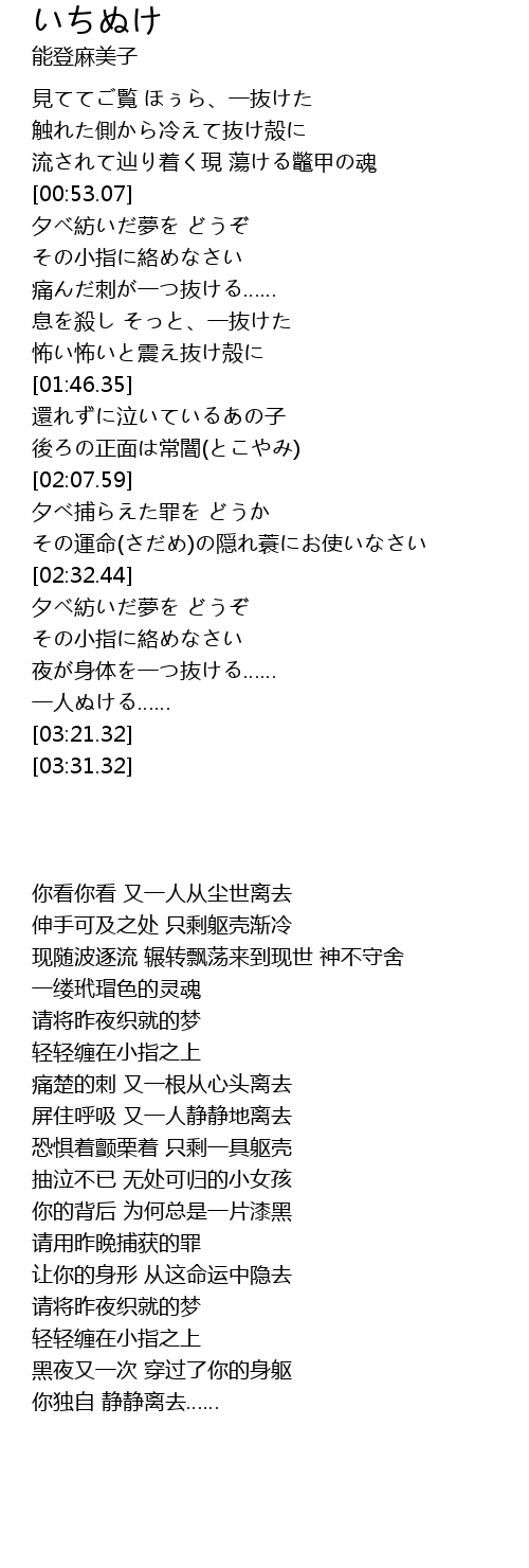 | [00:32.57] | 流されて辿り着く現 蕩ける鼈甲の魂 |