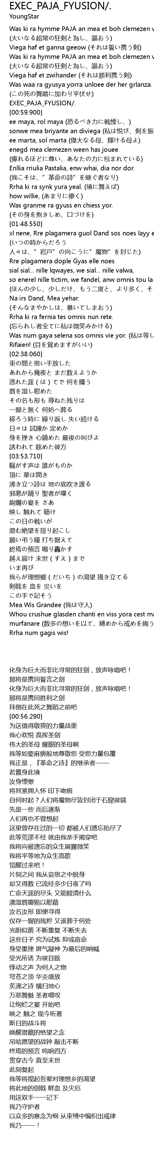 | [00:37.790] | Was ki ra hymme PAJA an mea et boh clemezen viega (大いなる超常の狂剣と為し、謳おう) |