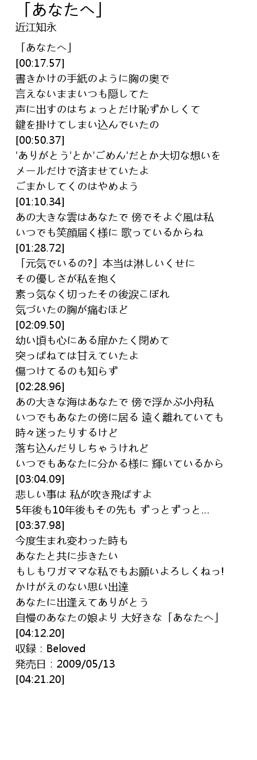 | [04:03.87] | 自慢のあなたの娘より 大好きな「あなたへ」 |