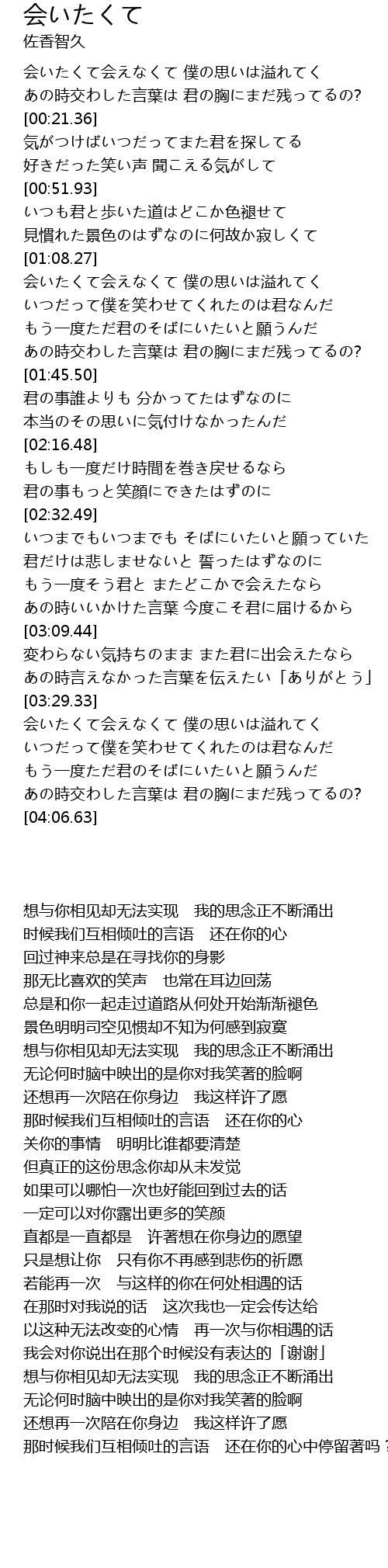 | [03:29.57] | 会いたくて会えなくて 僕の思いは溢れてく |