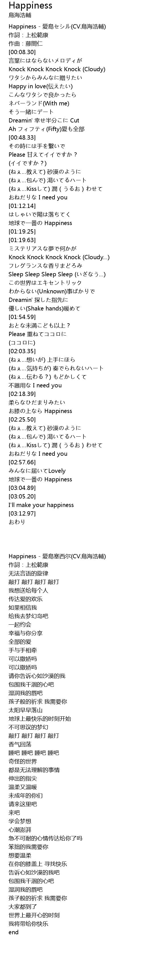 | [00:00.54] | Happiness - 愛島セシル(CV.鳥海浩輔) |