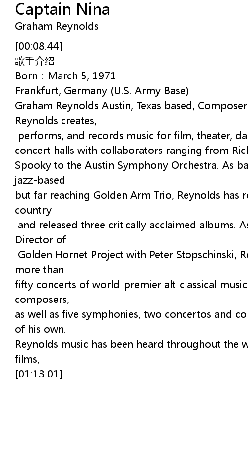 | [00:27.43] | Graham Reynolds Austin, Texas based, Composerbandleader Graham Reynolds creates, |