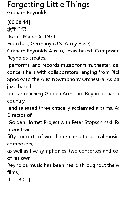 | [00:27.43] | Graham Reynolds Austin, Texas based, Composerbandleader Graham Reynolds creates, |