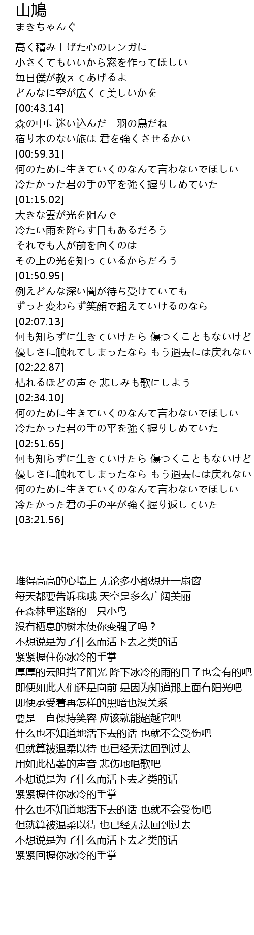 | [00:43.74] | 森の中に迷い込んだ一羽の鳥だね |