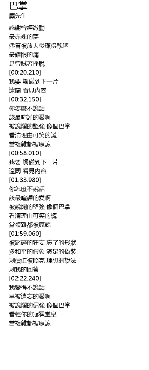 | [01:44.280] | 被說爛的堅強 像個巴掌 |