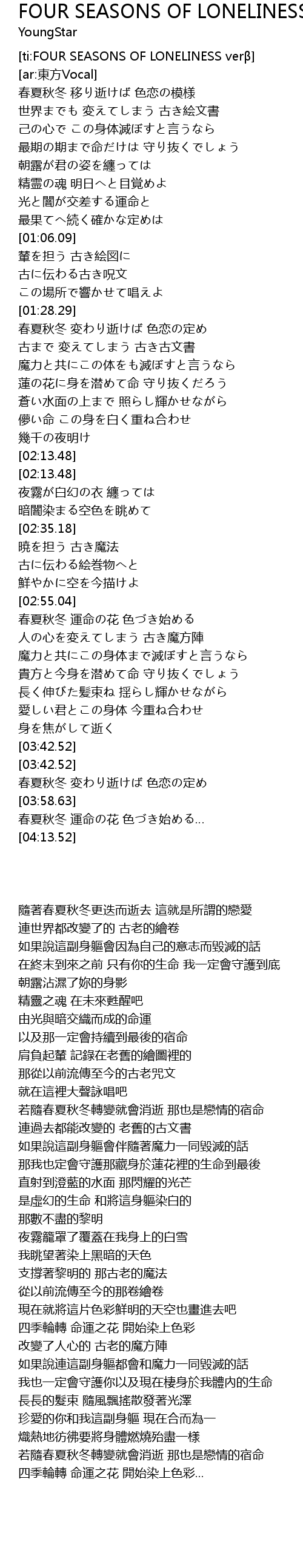 | [04:04.02] | 春夏秋冬 運命の花 色づき始める… |