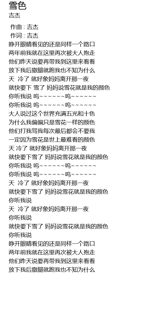 | [00:43.410] | jiù kuài yào xià xuě le mā mā shuō xuě huā jiù shì wǒ de yán sè |