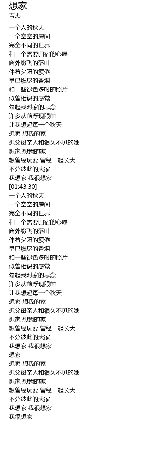 | [01:36.44] | wǒ xiǎng jiā wǒ hěn xiǎng jiā |