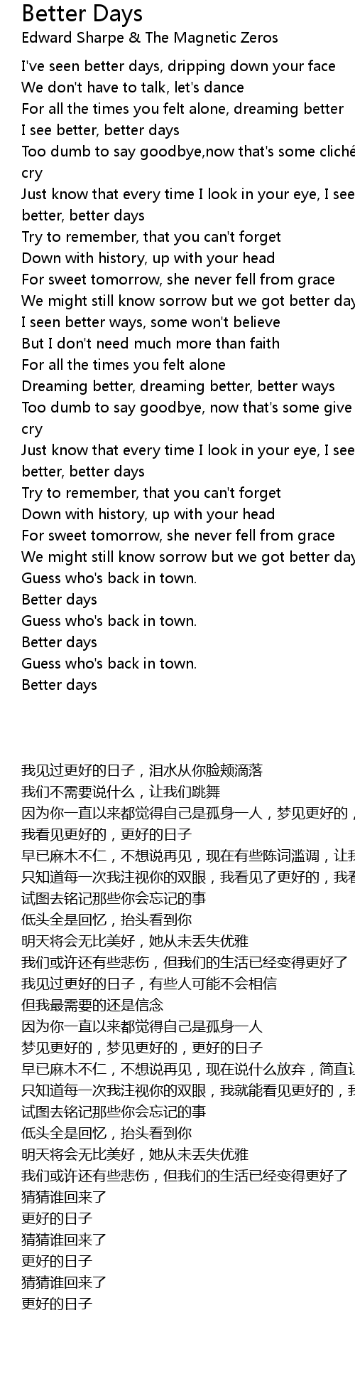| [00:34.730] | Just know that every time I look in your eye, I see better, I see better, better days |