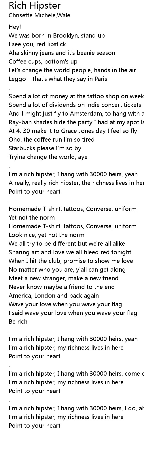 | I'm a rich hipster, I hang with 30000 heirs, come on aha | |