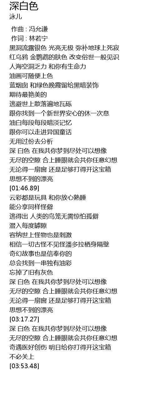 | [03:19.83] | 深 白色 在我共你梦到尽处可以想像 |