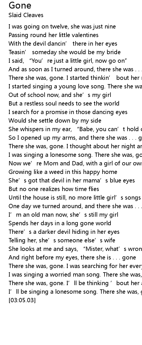 | [02:46.51] | I was singing a worried man song. There she was, gone |