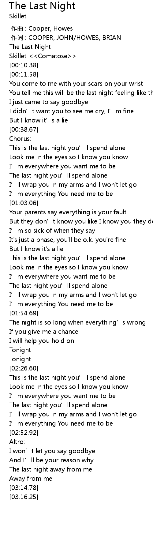 | [02:43.91] | The last night you’ll spend alone |