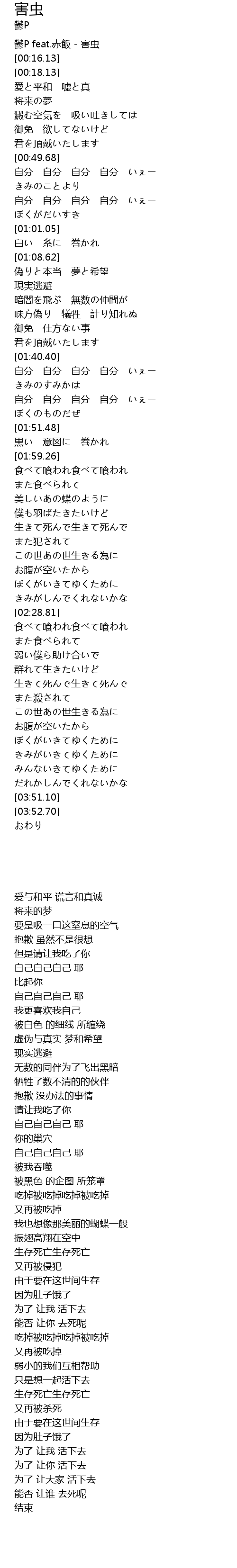 | [00:00.00] | 鬱P feat.赤飯 - 害虫 |
