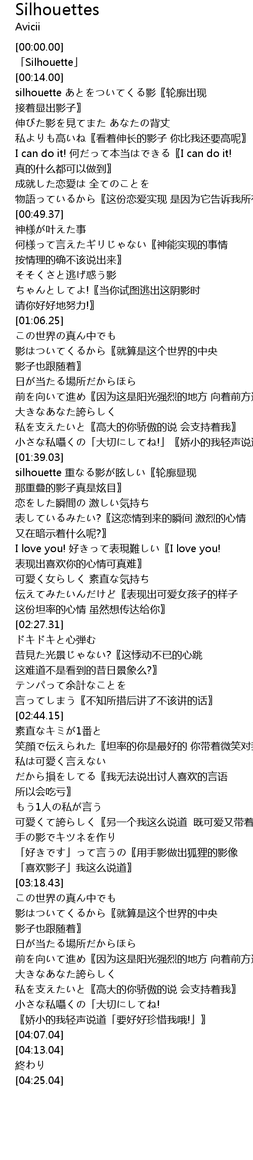 | [00:17.76] | silhouette あとをついてくる影〖轮廓出现 接着显出影子〗 |