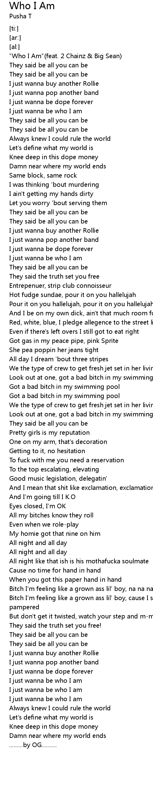 | [00:00.00] | "Who I Am"(feat. 2 Chainz & Big Sean) |