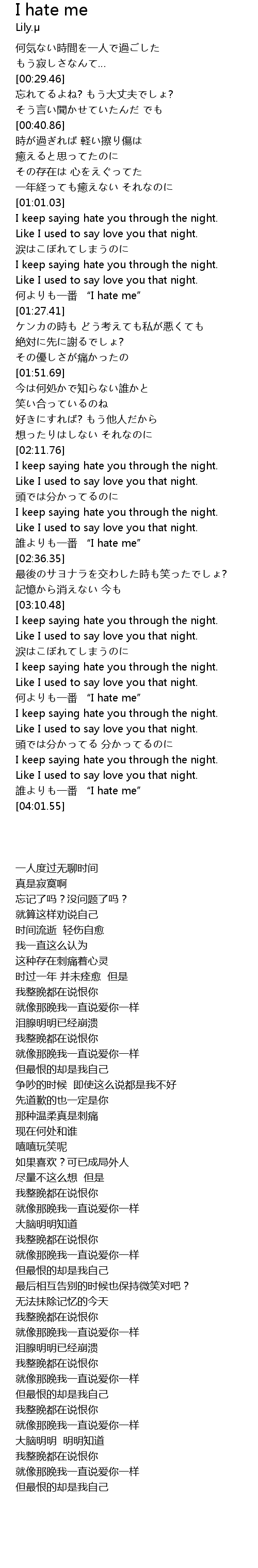 | [01:16.38] | 何よりも一番 “I hate me” |
