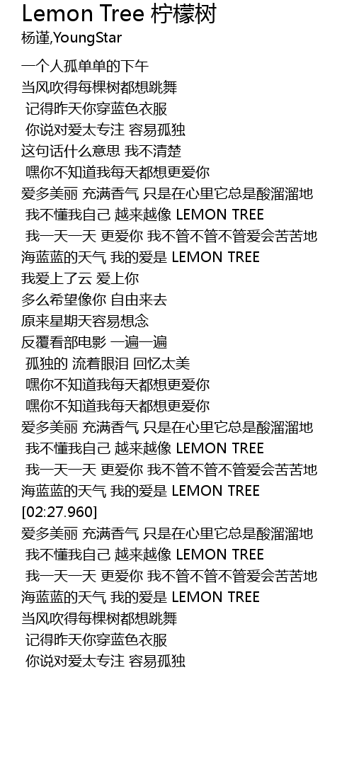 | [02:11.070] | hai lan lan de tian qi wo de ai shi LEMON TREE |