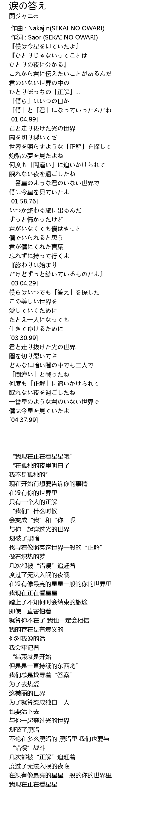 | [00:00.00] | zuo qu : Nakajin SEKAI NO OWARI |